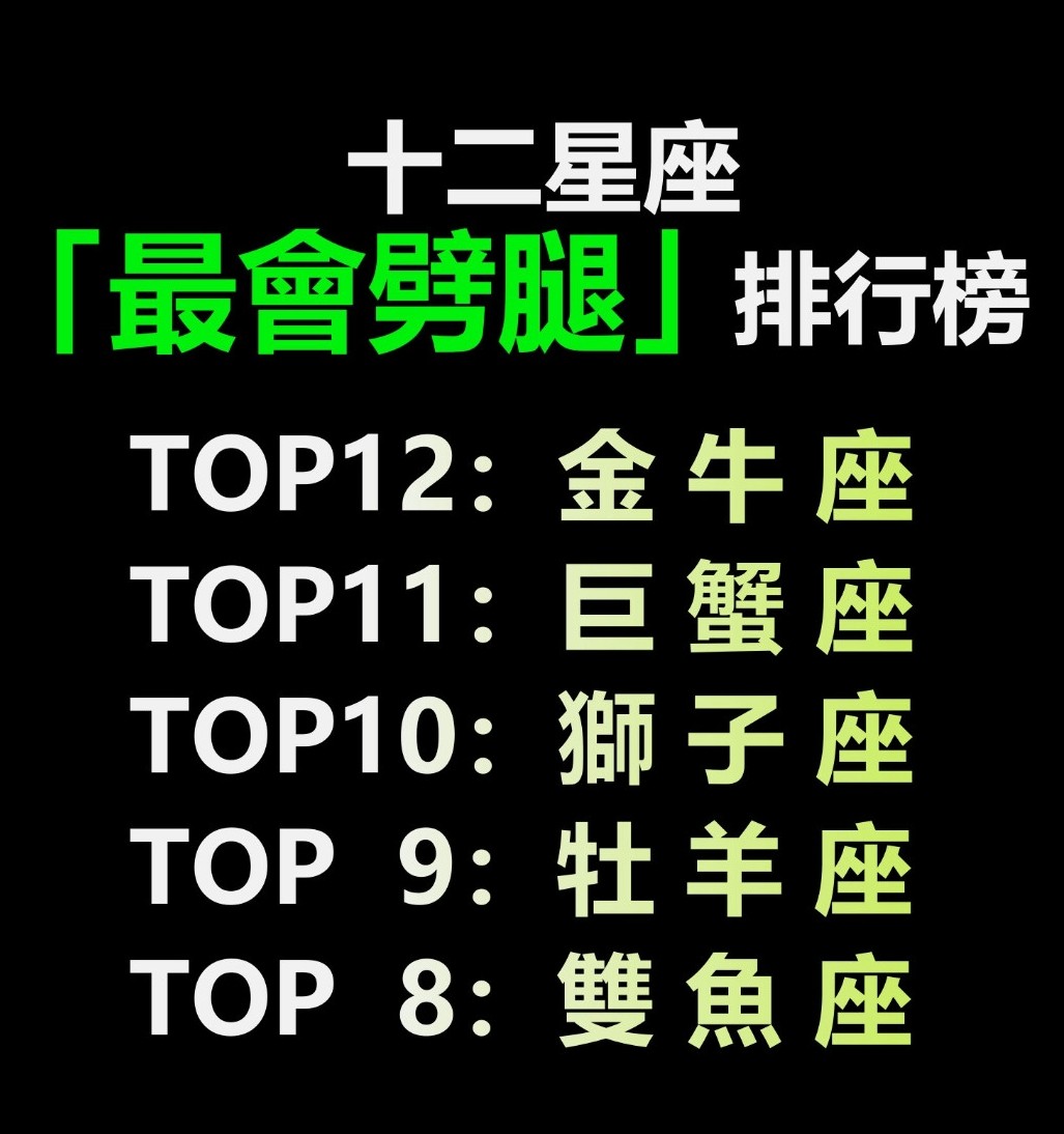 十二星座最會「劈腿」排行榜!金牛座很看重家庭 第一名「看似老實憨厚」實際超會藏人 HUNNIER 2023-09-14 檢舉 快來看看你排第幾! Advertisements 文章未完,前往下一頁繼續閱讀 下一頁 1/2 Advertisements 編輯精選推薦 More + 年底最強運!2025年剩不到100天「3星座運勢大爆發」 默默耕耘「年底喜迎大豐收」 12星座「花心指數排行」大公開!天蠍冷酷「但對感情100%專一」 冠軍「對任何事都3分鐘熱度」天生花心 「老公管不住」的4大生肖女!尤其第二個:年輕時如花似玉,年老時依然人見人愛 「6生肖」接福報:一筆橫財來了!鈔票大獎追著跑 記得提醒家裡人 媽祖點你了!「5生肖」馬上翻身 恭喜上榜生肖 算命師說:「一等命」的5個生肖 「越老越富有」70歲都不愁沒錢花 運勢撥雲見日!10月中旬「4生肖」鴻運當頭 努力被看見「正財、偏財滾滾來」 十二星座「心狠指數」排行榜!溫柔天秤座太容易心軟 第一名「鐵石心腸」絕不念舊情 婚後沒責任心!最容易花心「不聽老婆話」的4大星座男:交往一個樣,婚後一個樣 婚姻中,愛妻如命、細水長流的三大星座男!第一名簡直是「老婆傻瓜」 情緒寫在臉上!一不高興就「擺臭臉 」的3大生肖 感覺全世界都欠他的一樣 心太軟!容易「吃虧」的5個生肖女 晚年有福「子女孝順」後福深厚 永遠把自己放第一!「最沒良心」的三大星座 冠軍「無視別人痛苦」做到六親不認 生肖猴:十猴九不順,生於農曆這三個月「命最薄」 是生來還債的 一生善事做盡!最有「菩薩緣」的5大生肖 菩薩保佑一生衣食無憂 別被他們外表騙了!看似溫順淡定「但控制欲極強」的4大星座 #2利用個人魅力「悄無聲息操控你」 第一眼不覺得漂亮!時間久了「卻越看越喜歡」3星座女