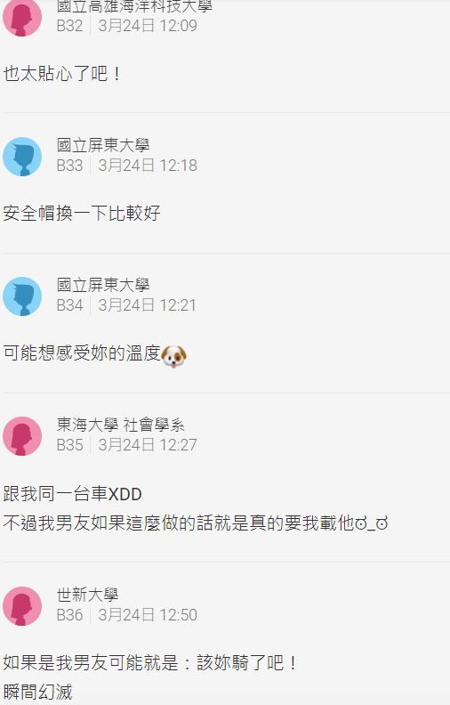 背後超暖原因曝光後,許多網友都對原PO男友的舉動羨慕不已,「學起來了」、「這種男友哪裡找」、「我男友就沒辦法這樣做...我跟他車高,他腿短」也有人分享自身經驗,「下雨天的時候坐墊如果是濕的 男友也會用自己的屁股先幫我用乾」。