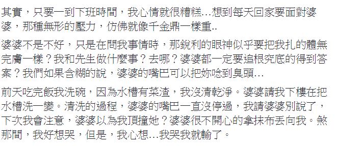 有一次吃飽後原PO到廚房洗碗,不小心留下一些菜渣在水槽,婆婆發現後馬上把她叫下樓要她重洗,過程中還不斷在一旁碎碎念,她請婆婆別再說了,也表示自己下次會注意,「婆婆以為我頂撞她?婆婆很不開心的拿抹布丟向我。煞那間,我好想哭,但是,我心想…我哭我就輸了。」