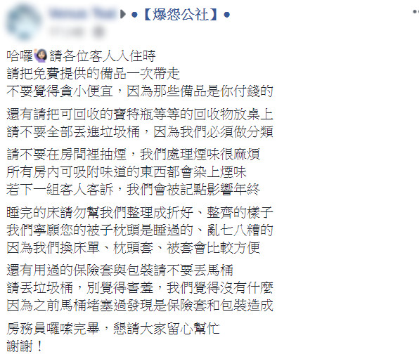 這篇提醒文吸引超過1.7萬人按讚,不少人紛紛驚呼長知識了,「老媽,這些年來罵妳貪小便宜我真的錯了」、「我以為回收物擺桌上會被當奧客」、「我都整理到像沒住過,原來是增加房務員的負擔!」