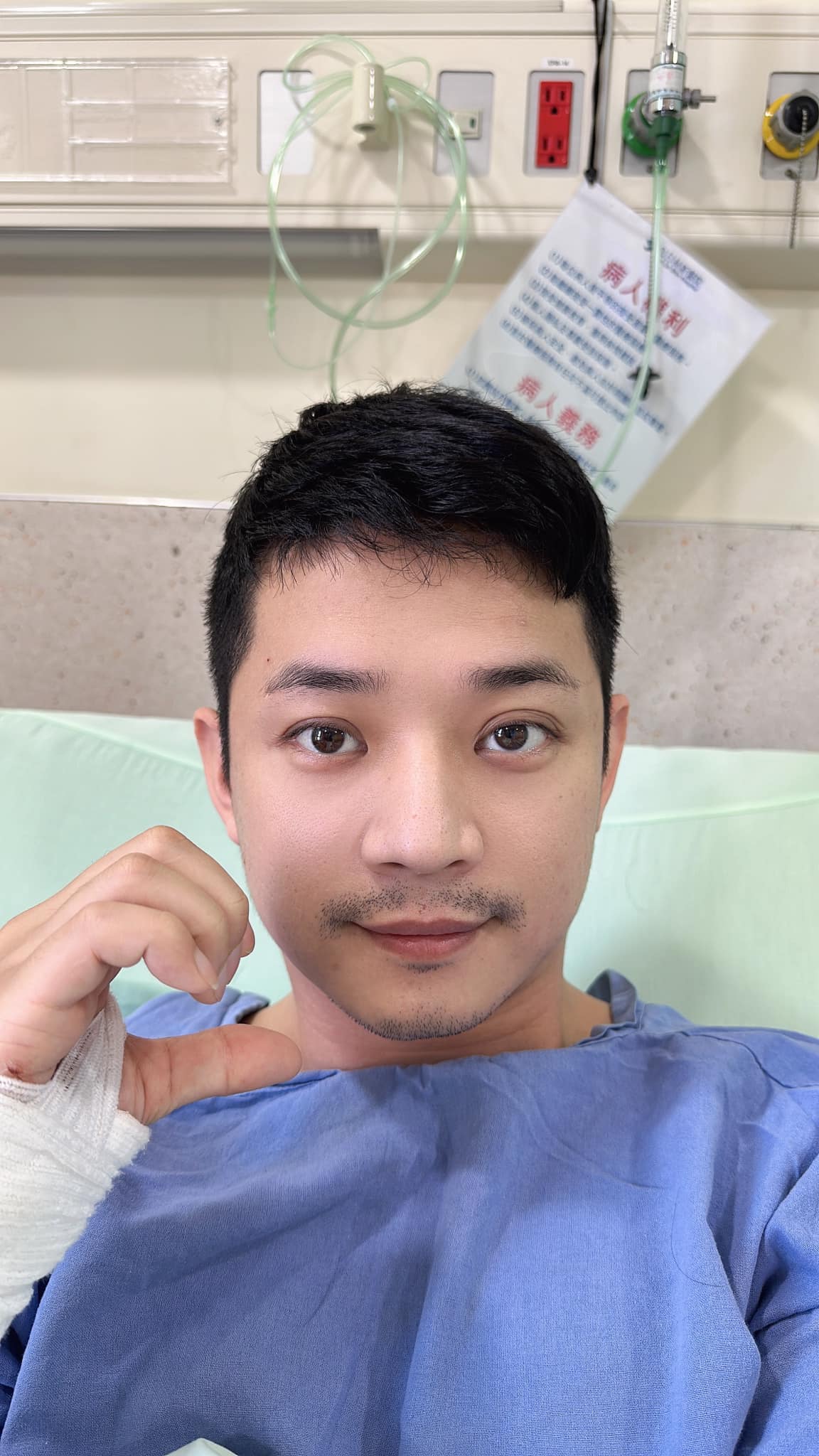 根據《TVBS》報導,吳勇濱透過社群平台報平安,躺在病床上、手部緊包繃帶,臉色憔悴仍比愛心自拍,堅強喊話:「我平安我沒事。」原來他上星期為了閃一台機車,不小心擦撞到路邊臨停的小客車照後鏡,失控打滑自摔,人飛出去還翻滾2、3圈,砰的一聲,嚇得附近店家衝出來看狀況。