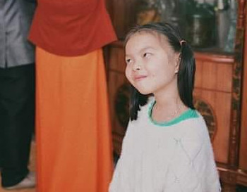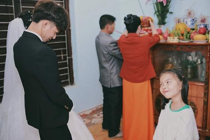 只見照片中新郎父母正忙著準備水果,背對著鏡頭祭拜祖先,而小女孩趁著長輩不注意,逮到機會立刻用斜眼怒瞪穿著西裝的叔叔....小女孩白眼翻得超徹底,嘴角努力地憋著笑,一臉被背叛的表情,彷彿像在質問新郎:「怎麼可以對不起我?」