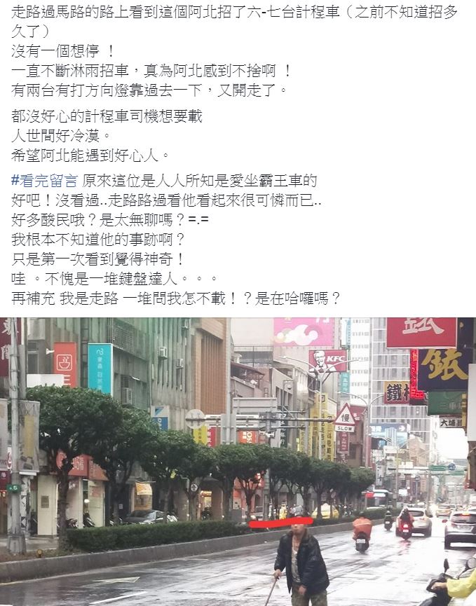 一名吳姓女網友在臉書社團「爆怨公社」PO文提到,在過馬路的路上看到一位阿北招了6、7台計程車,沒有一台停下,「一直不斷淋雨招車,真為阿北感到不捨啊 !」