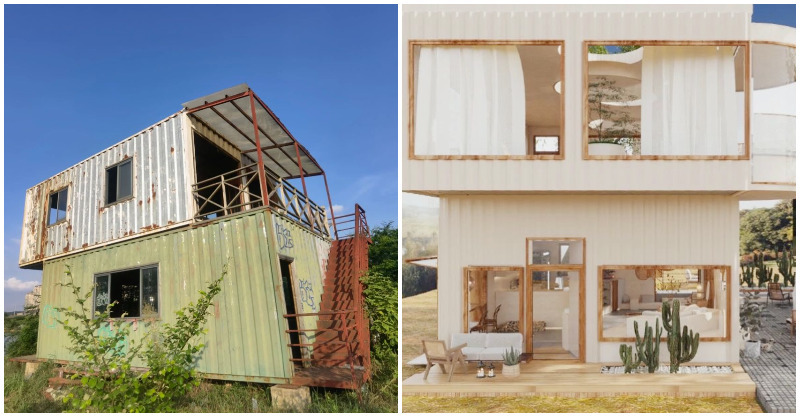 為了讓貨櫃屋得以跳脫過往有如牢籠、烤箱般的負面標籤,便突發其想地將兩個貨櫃交錯相疊後,以打破常規的造型替整個貨櫃屋定下了充滿新意的骨幹,並再完成外牆的粉刷後,使得原本黯淡無光的貨櫃屋,瞬間換然一新地變成令人驚嘆的簡約宜居房。