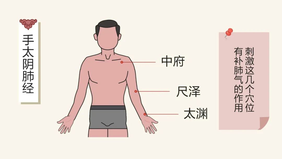 【中府穴】雙手叉腰,找到鎖骨外側下緣處是雲門穴,雲門穴往下一寸是中府穴。這個穴位可以補益肺氣。