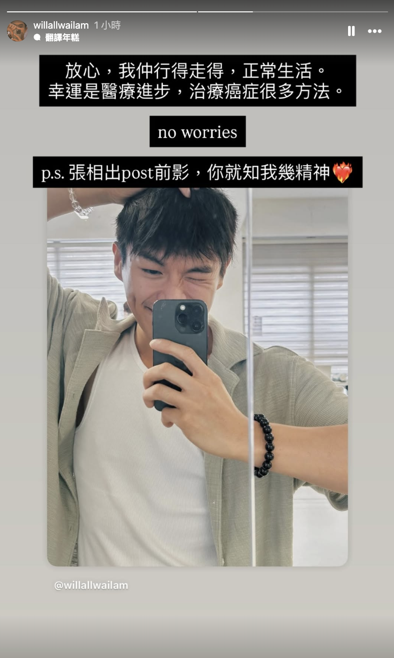 得知確診後他經歷了從否認、憤怒到最終接受的心路歷程,柯煒林坦言這個年紀罹癌,說心情不憂鬱不想幹譙天、幹譙全世界就是假的,甚至上網搜尋「如何接受自己患癌症」,但最令他動容的是父親緊緊擁抱著他痛哭,質問為何不是自己得病,讓他知道要為愛自己、自己愛的人努力下去,希望身邊人看到他不要說加油,要微笑點頭,相信他會打贏逆境波!